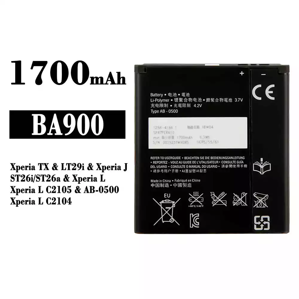 Batteri BA900 til Sony Xperia TX / LT29i / Xperia J / ST26i / ST26a / Xperia L / Xperia L C2105 / AB-0500 / Xperia L C2104