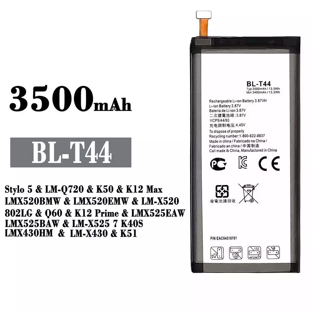 Batteri BL-T44 til LG Stylo 5 / LM-Q720 / K50 / K12 Max / LMX520BMW / LMX520EMW / LM-X520 / 802LG / Q60 / K12 Prime / LMX525EAW / LMX525BAW / LM-X525 7 K40S / LMX430HM / LM-X430 / K51