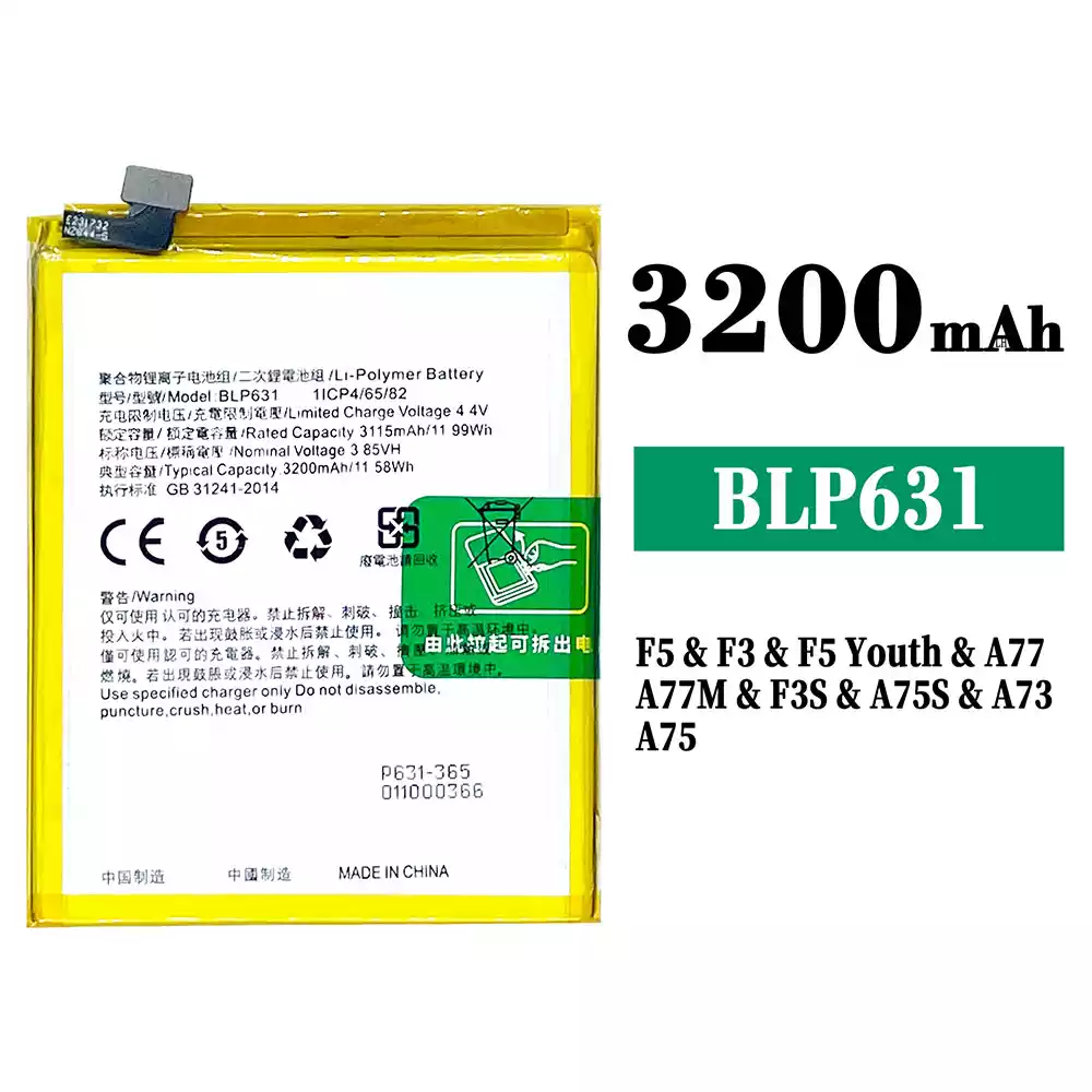 Batteri BLP631 til OPPO F5 / F5 Plus / CPH1723 / CPH1727 / CHP1723 / CHP1727 / F5 Youth / A73 /CPH1725 / F3 / CPH1609 / A77 / CPHl715 / A75