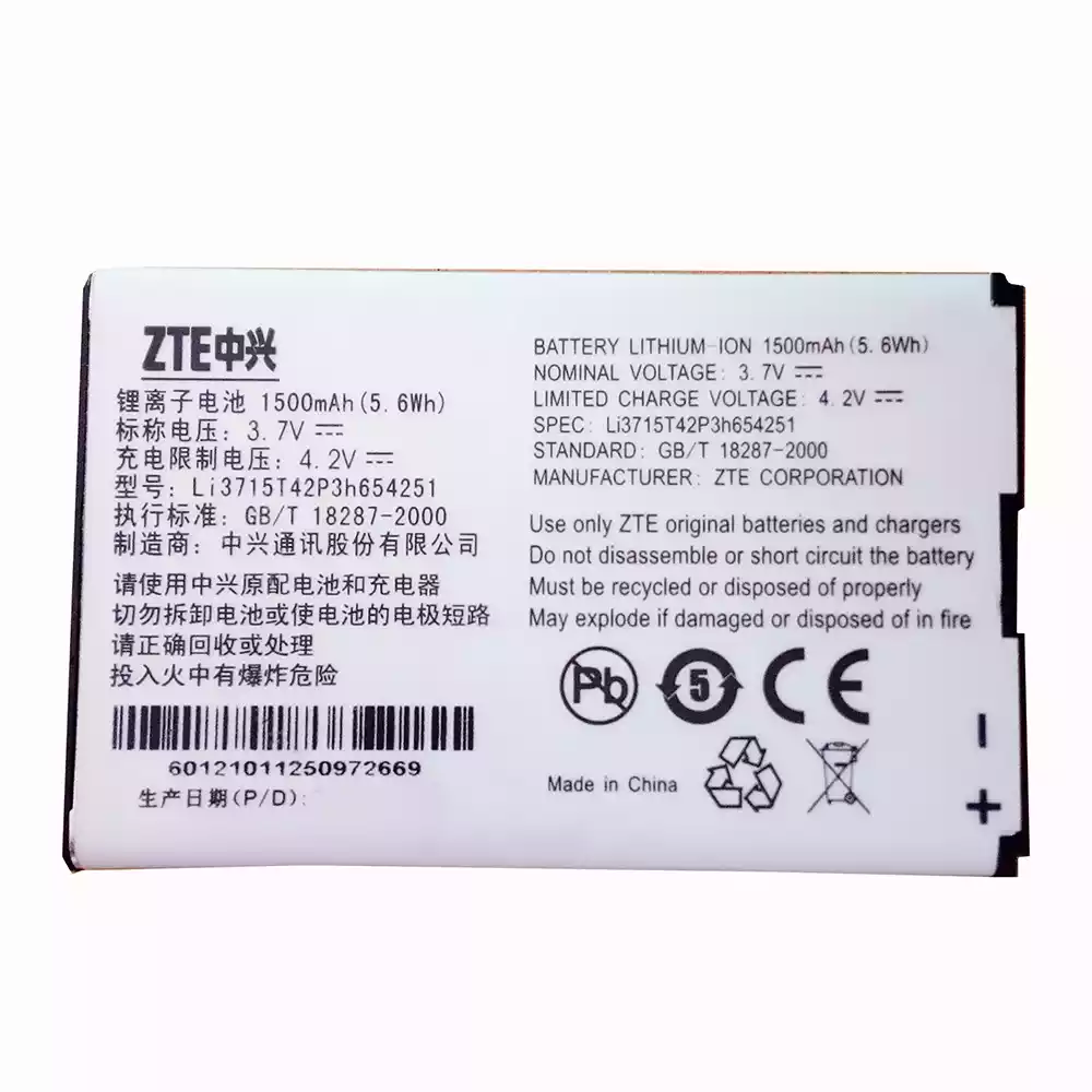 Batteri LI3715T42P3H654251 til ZTE MF65,MF62,MF61,MF60,MF30,AC33,AC30,Z320,U900,U722,U232,U960,U862,U728,U720,U700,V960,VF945,V859,V857,V790,X925,X920,X501,D810,D800